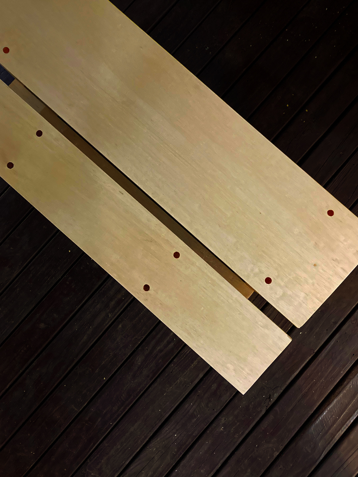 O banco foi montado com parafusos, mas para fazer uma alusão ao prego, escolha comum na montagem de bancos caipiras, foi utilizado cavilhas de madeira em tom contrastante ao da caixetas, evidenciando o furos dos parafusos.